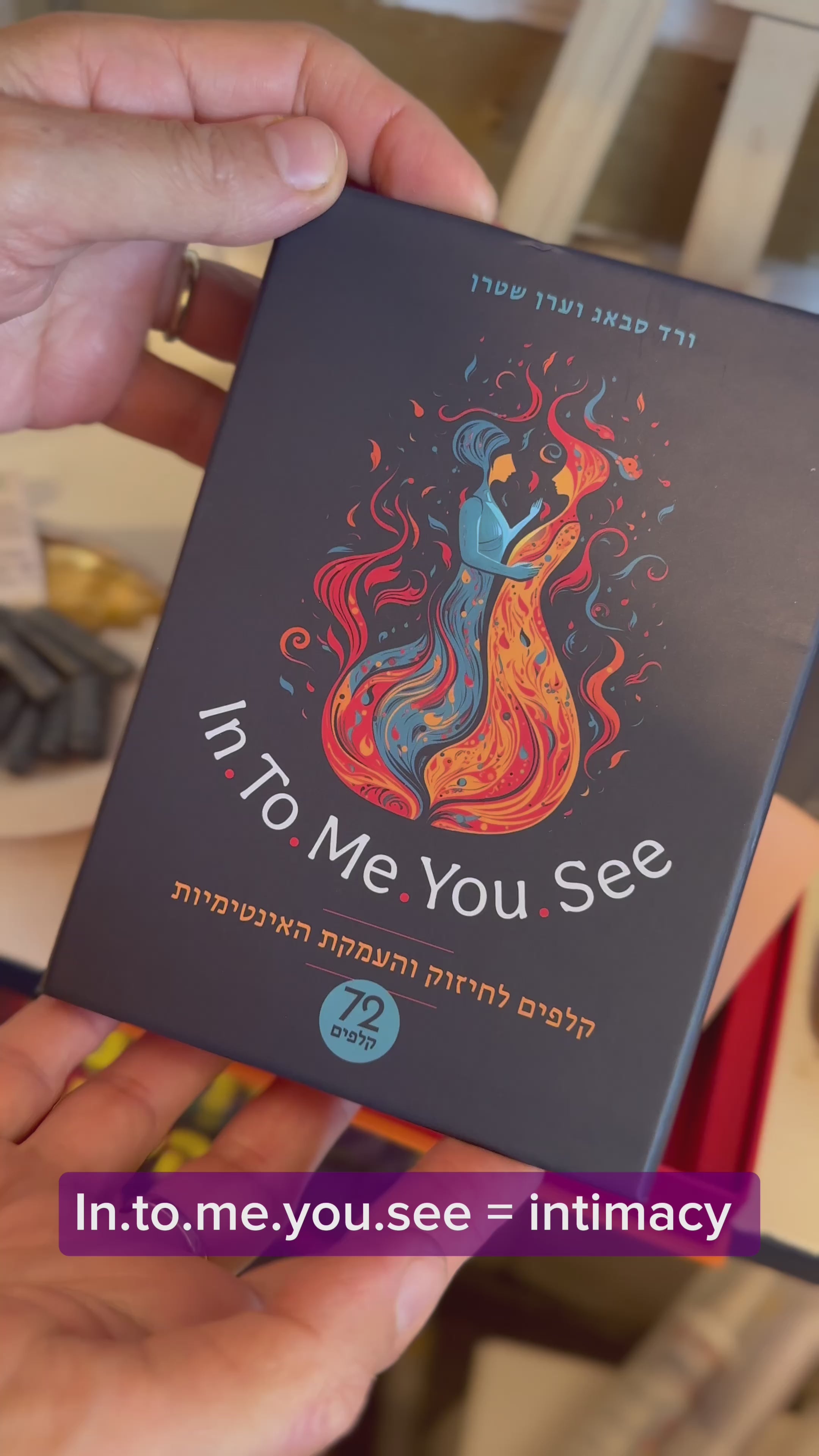 קלפי In.To.Me.You.See (משחק מילים על המילה אינטימיות) היא ערכת כלים בעברית מדהימה לזוגות המאפשרת דרך קלילה, ליזום דיאלוג על נושאים שלעתים קרובות לא עולים בשיחות רגילות. הקלפים מחולקים לשלושה נושאים: ראש - קלפים העוסקים במחשבות, היגיון, תכניות וכדומה. רגש - קלפים העוסקים ברגשות ודרכים לחשוף אותן. מיניות - שאלות הקשורות באינטימיות בין בני הזוג.